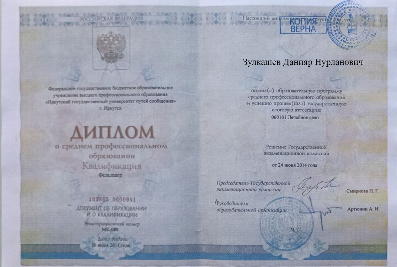 Меня зовут Зулкашев Данияр Нурланович, я — фельдшер выездной наркологической бригады в наркологической клинике "Плюс" в Корсакове. Я стремлюсь помогать людям, оказывая квалифицированную медицинскую помощь в самых разных ситуациях, и верю, что каждый пациент заслуживает внимания и поддержки на пути к выздоровлению.